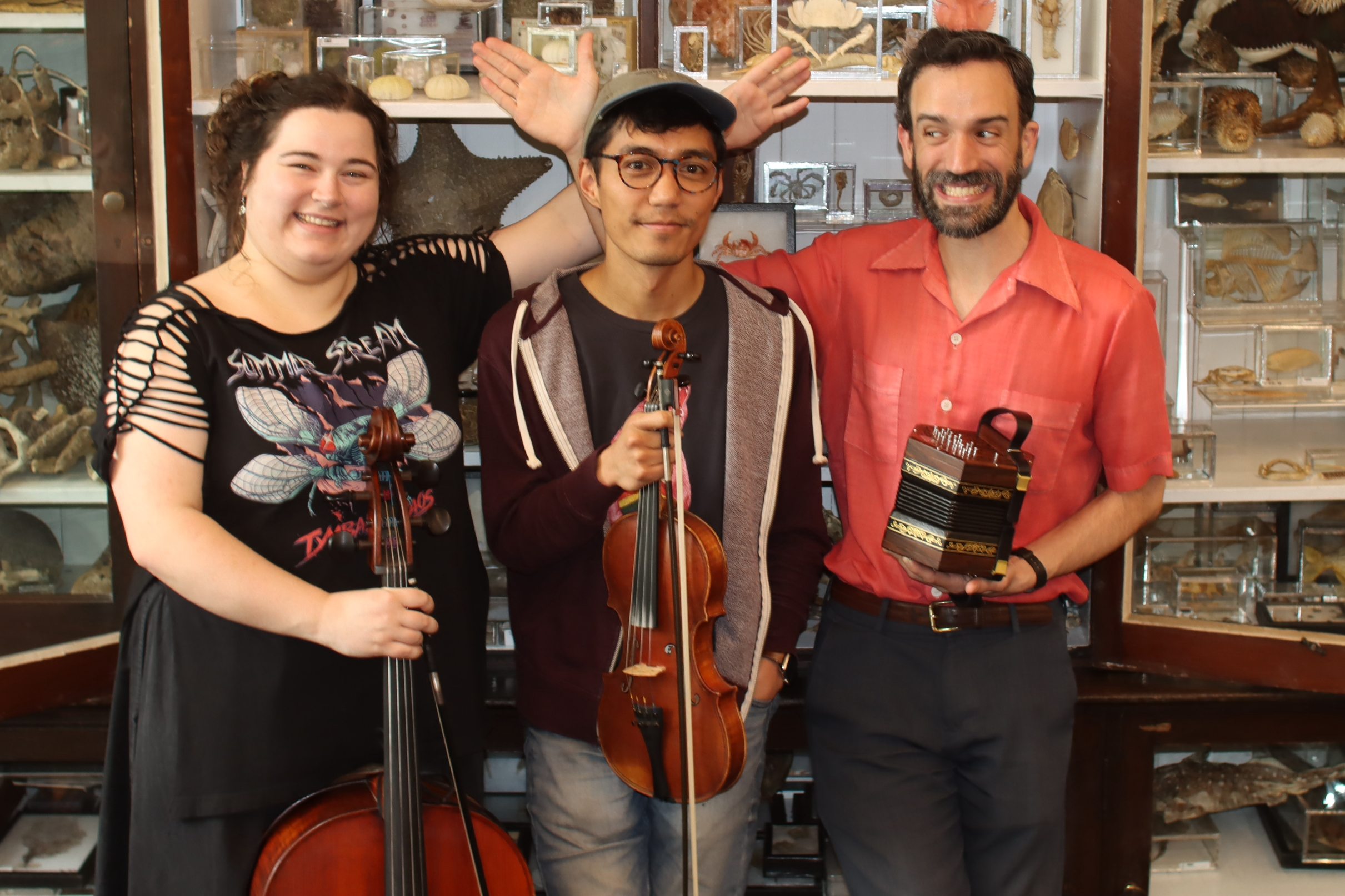 THE VOX HUNTERS – Armand Aromin, Benedict Gagliardi, and Flannery Brown – are musical symbionts that sprouted from a mutual loam. Soon after, they began to hum in sympathy, eventually buzz in synchrony, and now whomp with full-lunged abandon. Like a lively fungus on the branches of tradition, they nourish themselves on its ancient heartwood and burgeoning boughs-to-be. They are the Pope’s frown, a wagon of porcupines, that cup of tea next to the worm bin. They sing for you and each other. As for the birds? Especially so.